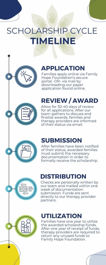 Our therapy scholarships are to be utilized for any future therapy appointments at your designated therapy provider center. Family Hope Foundation scholarship funds cannot be used for past-due balances, respite-type activities, evaluations, missed appointment fees, or medical procedures.